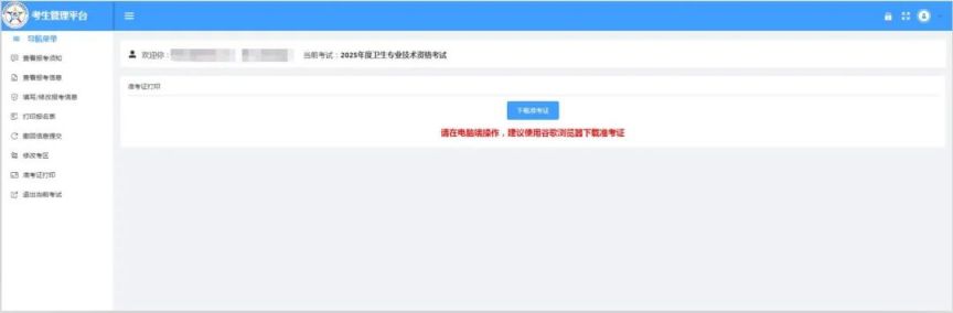 3. 查询准考证:登录成功后,在网站左侧菜单栏中找到“准考证打印”选项,点击进入。
