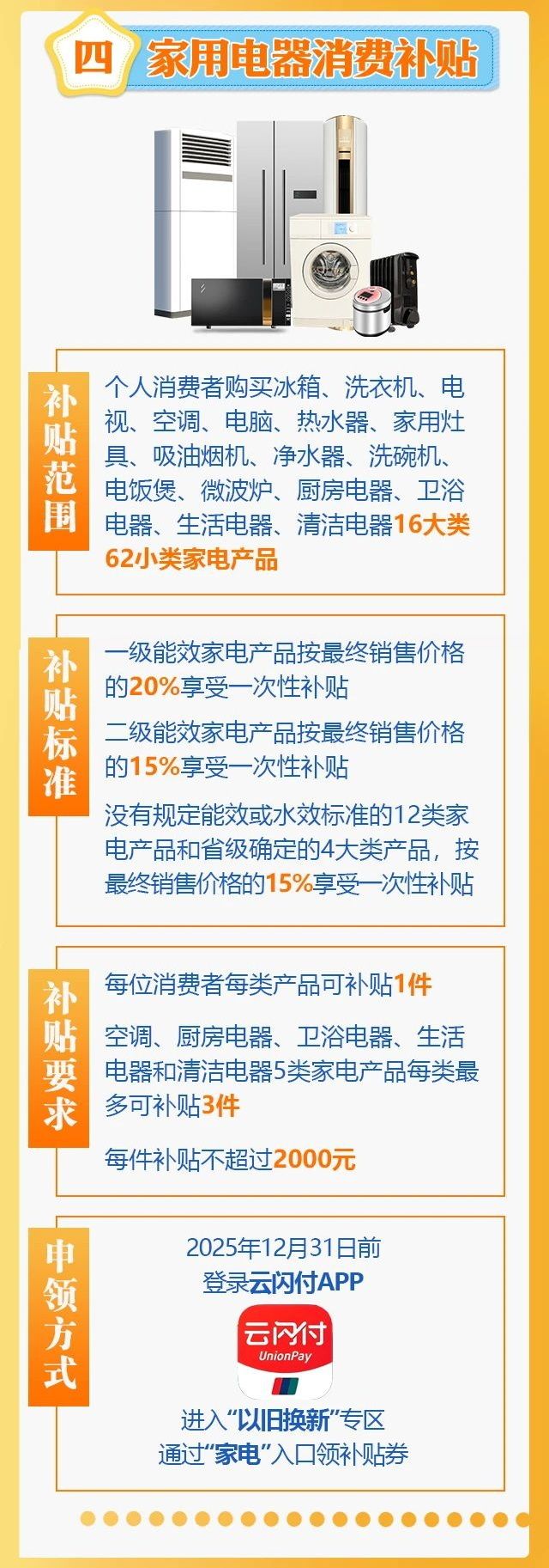 1.个人消费者于2025年12月31日前登录云闪付APP(含云闪付输出服务的其他APP),进入“以旧换新”专区,通过“家电、数码、家装厨卫”各入口领取相应品类补贴券,在参与企业(或线上平台)购买符合条件的商品(收货地址应当在湖南省内),在支付环节按补贴标准直接扫码抵扣。