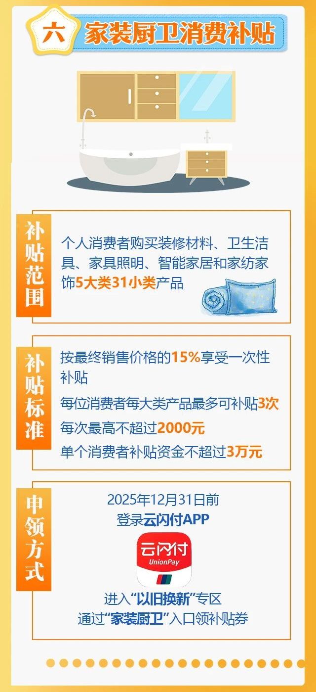 家装厨卫产品按照产品最终销售价格的15%给予补贴,每位消费者每大类产品最多可补贴3次,每次最高不超过2000元,单个消费者补贴资金不超过3万元。