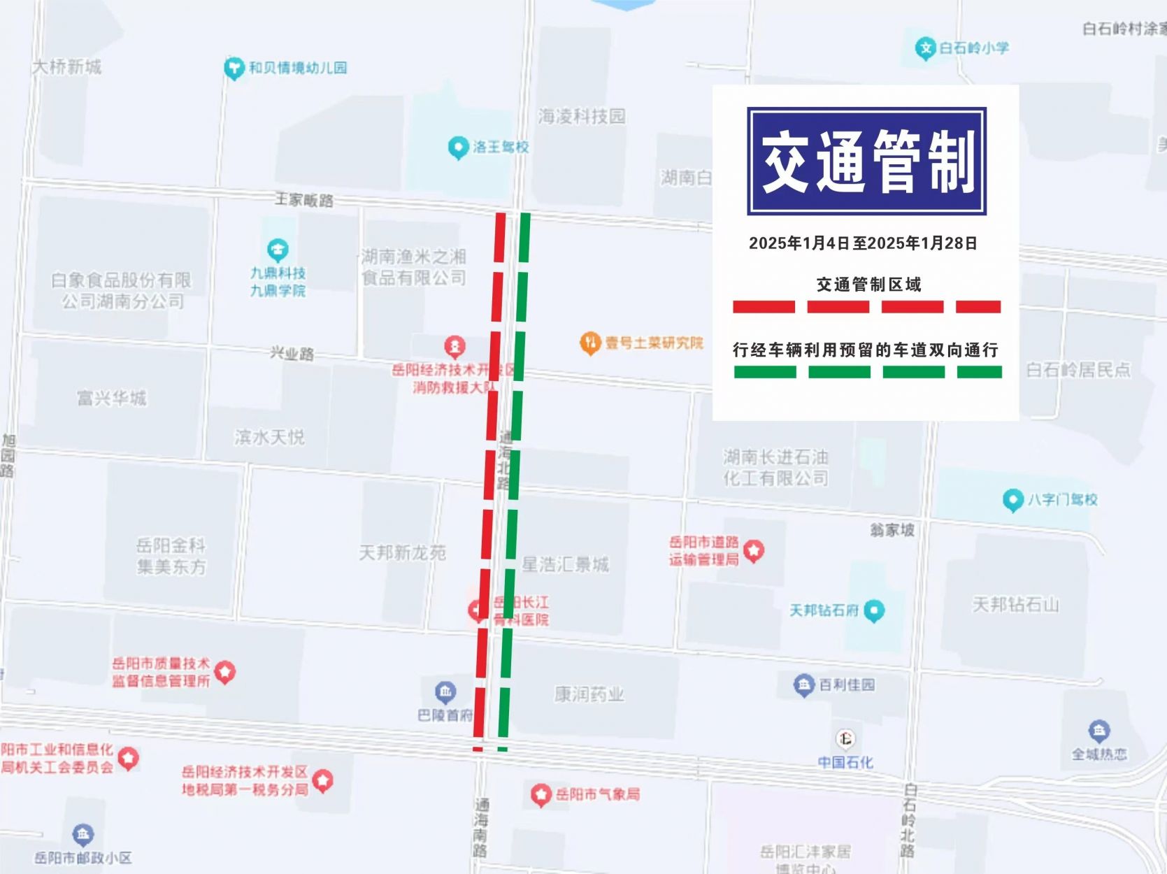 收到,1月4日起岳阳通海路多段将实施临时交通管制。以下是一些建议,帮助您在出行时调整路线: